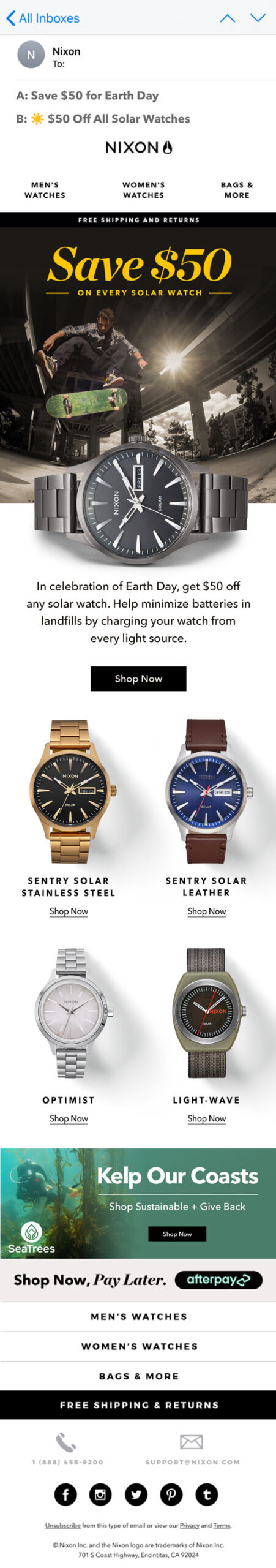 My work focused on digital design for multi-channel campaigns. With assets spanning emails, landing pages, on-site, paid social, you name it. My main focus was finding ways to make things move, capture attention quickly, and learn to get the most mileage out of any asset. I also spearheaded Nixon’s first retention email series: a personalized, multi-step campaign that not only engaged new customers right after their first purchase, but also cross-sold other products and wove them deeper into the brand story.